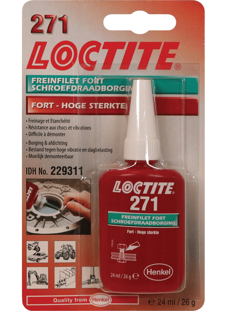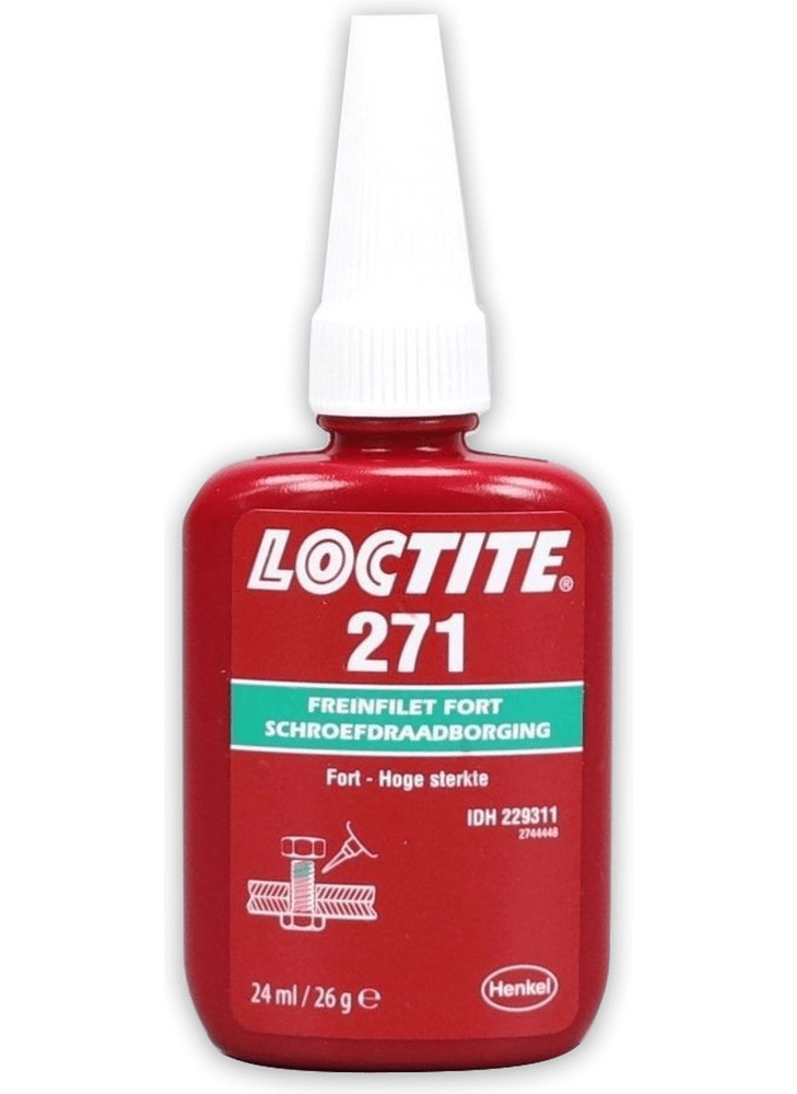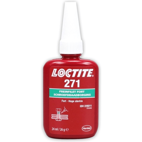Loctite 271 is een rood, op methacrylaat gebaseerd schroefdraadborgmiddel met lage viscositeit en hoge sterkte. Fixatietijd van 10 min. op staal, 5 min. op messing en 15 min. op roestvrij staal. Ideaal voor toepassingen waarbij elke migratie van de lijm moet worden voorkomen. Bestand tegen lichte vervuiling van industriële oliën. Geschikt voor alle metalen bevestigingen. Losbreeksterkte van 26 Nm op M10 bouten. Fluoresceert onder UV-licht. Lage viscositeit. Fluorescerend product dat kan worden gecontroleerd. Voorkomt bewegingen, loskomen, lekken en ongewenste corrosieverschijnselen. Is bestand tegen trillingen. Hoge weerstand. Afdichting van de schroefdraad waardoor boren mogelijk is.