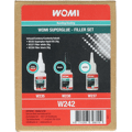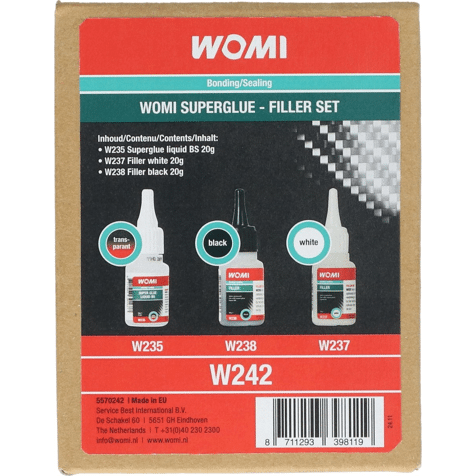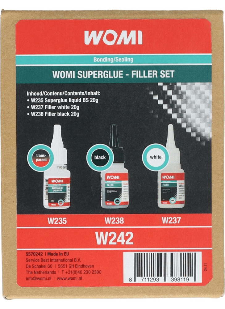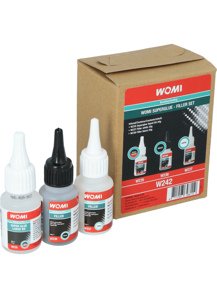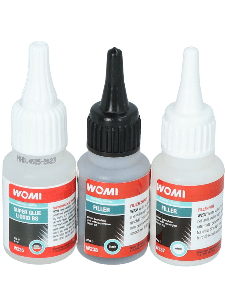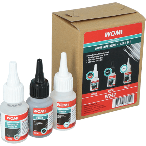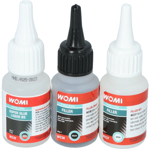 Deze 3-delige Womi filler set is de ultieme oplossing is voor het snel vullen van gleuven, gaten, voegen of het maken van versterkingen. De set bestaat uit de Womi W235 secondenlijm en twee Womi vulstoffen W237 (wit) en W238 (zwart). De Womi W235 is een hoog vloeibare secondenlijm met ultra snelle droogtijd. De lijm is hand vast na 2-5 seconden. De zwarte of witte Womi fillers kunnen samen met de Womi secondenlijm gebruikt worden voor moeilijke, slecht passende verbindingen. Na uitharding kan deze bewerkt worden zoals schuren, boren of worden overgespoten. Zowel de secondenlijm en de fillers hebben een inhoud van 20 gram.