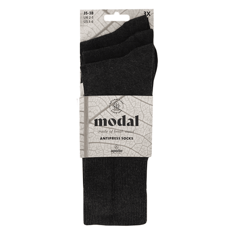 Geniet van deze Apollo Modal antipress sokken met hoog draagcomfort dankzij een extra lange boord met ribstructuur en handgekettelde teennaad. Door het ontbreken van elastiek in de boord biedt dit product een zeer comfortabel en niet drukkend gevoel voor iedere dag. Zeer geschikt bij last van bloedvatenvernauwing, trombose of het vasthouden van vocht. De modal stof kent een fijn gebreide structuur met een hoge slijtvastheid en houdt je voeten droog en fris. De gladde en zijdeachtige stof zorgt voor een luxe en nette uitstraling. Modal is bovendien duurzaam, biologisch afbreekbaar en de productie is minder belastend voor het milieu.