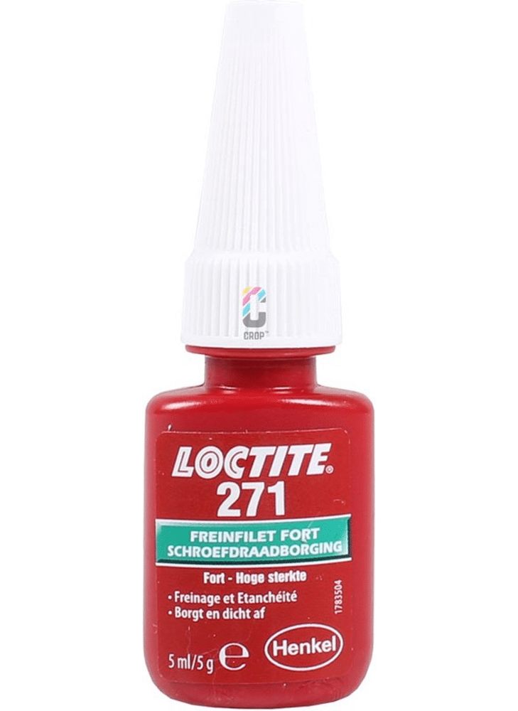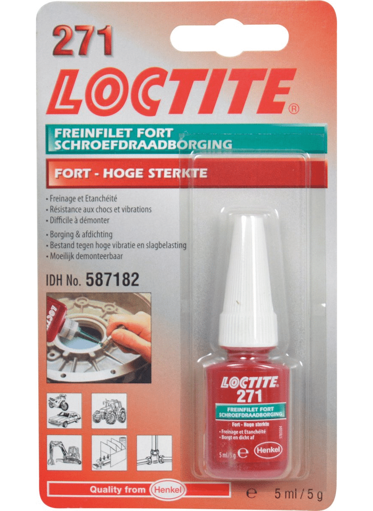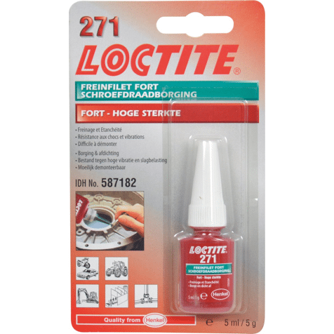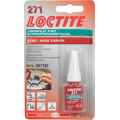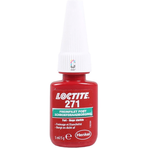 Loctite® 271 Rood schroefdraadborgmiddel op basis van methacrylaat met hoge sterkte en lage viscositeit, dat fluoresceert onder uv-licht om controle mogelijk te maken Loctite 271 is een rood, op methacrylaat gebaseerd schroefdraadborgmiddel met lage viscositeit en hoge sterkte. Fixatietijd van 10 min. op staal, 5 min. op messing en 15 min. op roestvrij staal. Bestand tegen lichte vervuiling van industriële oliën. Geschikt voor alle metalen bevestigingen. Losbreeksterkte van 26 Nm op M10 bouten. Fluoresceert onder UV-licht.