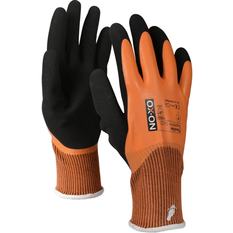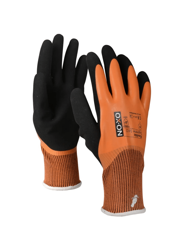OX-ON Flexible Supreme 1612 is een 100% waterdichte handschoen voor wie werkt met bijvoorbeeld metsel- en constructiewerk, steigerbouw, tuinbouw, tuinieren en renovatie. De handschoen heeft een voortreffelijke pasvorm, een uitzonderlijk vingergevoel en een unieke soepelheid en biedt tegelijkertijd uitstekende grip – zowel nat als droog. De handschoenen zijn daarom ook de perfecte keuze voor de meest veeleisende taken. Met OX-ON Flexible Supreme 1612 krijgt u een extreem zachte en comfortabele handschoen met een dubbele latexcoating: de oranje binnencoating houdt uw handen droog. De buitenste zwarte coating biedt een buitengewoon goede grip. Het breisel is gemaakt van polyester waardoor de handschoen comfortabel draagt.