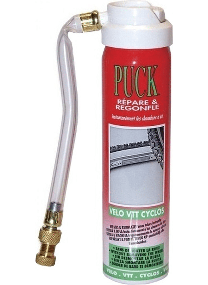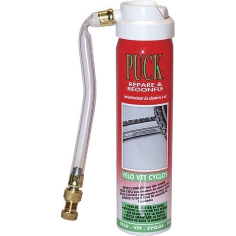 Puck bandenreparatie sprayDit reparatie middel voor jouw fietsbanden kan je gebruiken bij binnenbanden en tubeless banden. Het middel is goed doceerbaar en heeft een lange houdbaarheid.Gebruik:Zorg ervoor dat het ventiel aan de bovenkant van het wiel zit. Sluit de slang van de spuitbus aan op het ventiel en spuit de werkstof in de band. Draai de band hierna rustig met het product erin, zodat de werkstof zich kan verdelen in de gehele band. Nu kan je met een pomp of gaspatroon de band op de juiste druk brengen.Specificaties:Kleur: roodInhoud: 75 ml