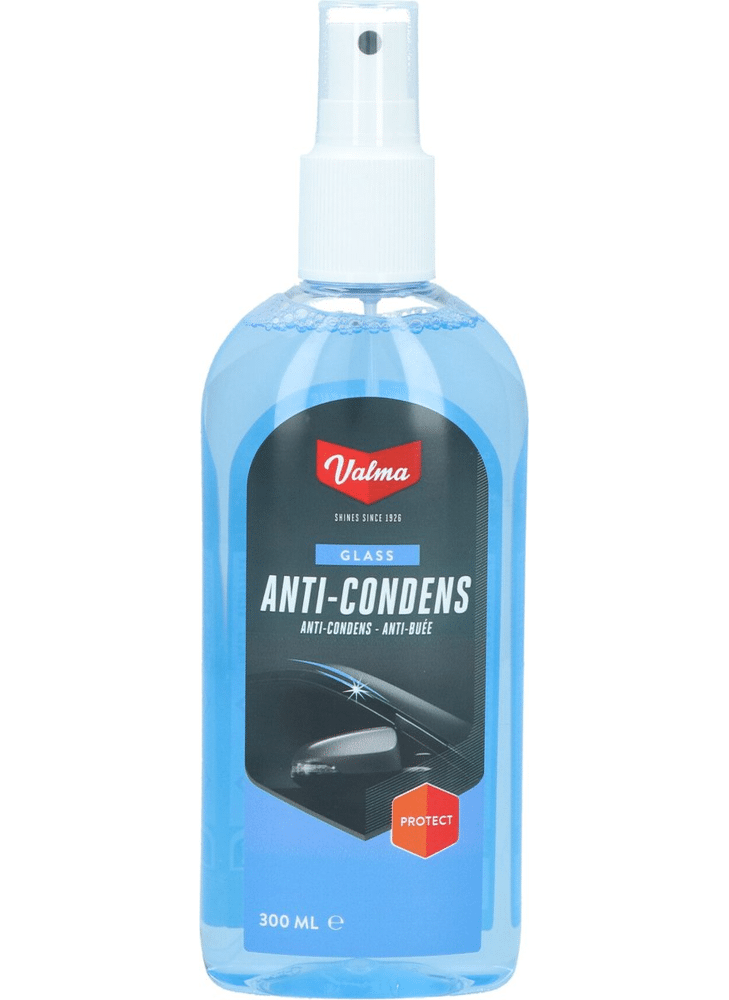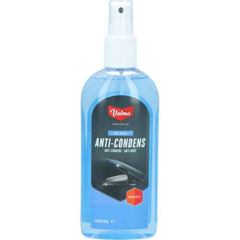 Valma anti condens is de oplossing tegen beslagen ramen en spiegels. Het voorkomt voor langere tijd het weer beslaan van autoruiten. Anti condens is ook te gebruiken op spiegels in de badkamer of op vizieren van helmen. Anti condens is eenvoudig in gebruik. Het te behandelen oppervlak moet schoon, droog en vetvrij zijn. Vanaf een afstand van ongeveer 20cm een dun laagje anti-condens opspuiten. Hierna met een schone doek nawrijven totdat het oppervlak droog is. Inhoud 300ml. Tip: Gebruik de Valma anti condens samen met de Valma Glasdoek voor kristalheldere ruiten en spiegels!