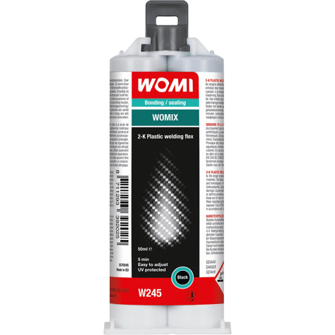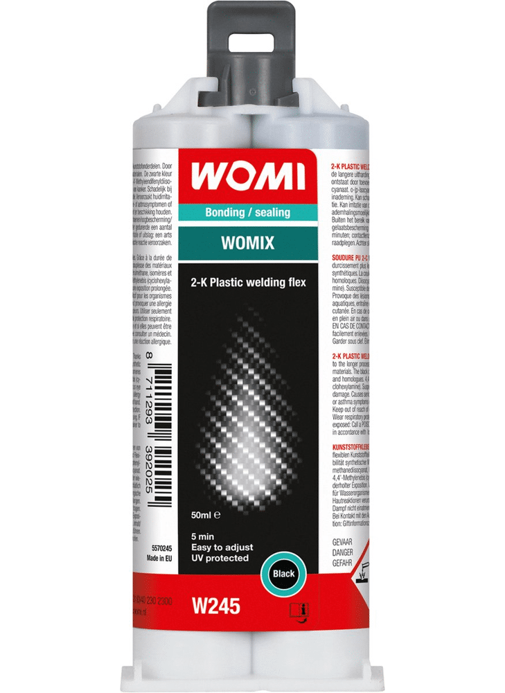 Womi 2K repair is de allerbeste 2 componenten lijm voor snelle flexibele reparatie of ijzersterke verbindingen. Womi W245 2K Plastic Welding Flex is een professioneel 2-componenten, self-mixing PU reparatiemiddel voor supersnel verlijmen en repareren van flexibele kunststofonderdelen. Door de langere uithardingstijd van 5 minuten, perfect voor moeilijk te verbinden delen, snel schuurbaar. Benadert de sterkte en flexibiliteit van synthetische materialen. De zwarte kleur ontstaat door toevoeging van koolstof, waardoor het product UV-bestendig wordt. Inclusief mixertip dus gegarandeerd altijd een perfecte menging en mengverhouding. De nieuwe speciale mixertipaansluiting voorkomt verkeerd opzetten. Inhoud 50ml, geschikt voor gebruik met de Womi W250 mixergun. Womi, Max Performance One-Stop-Solutions.