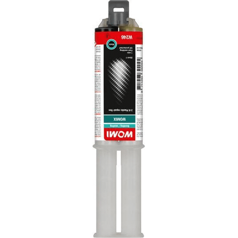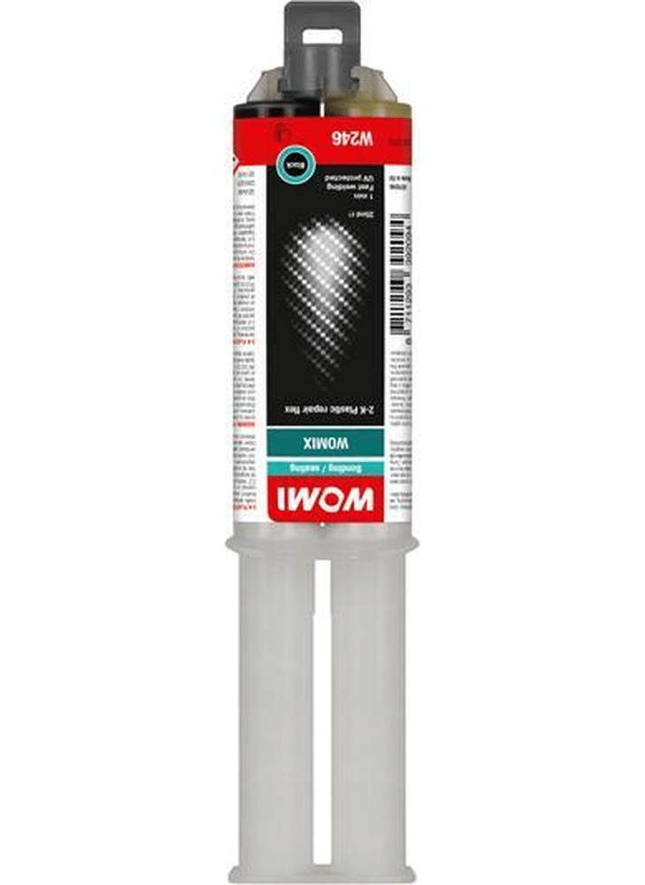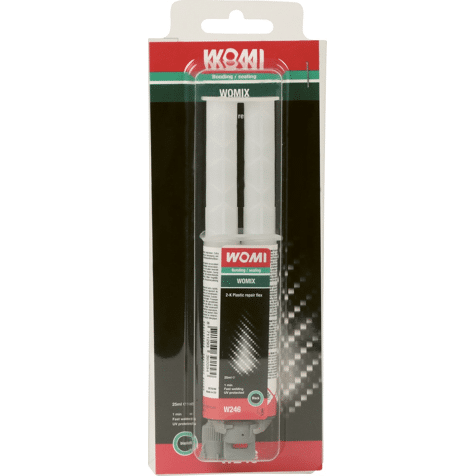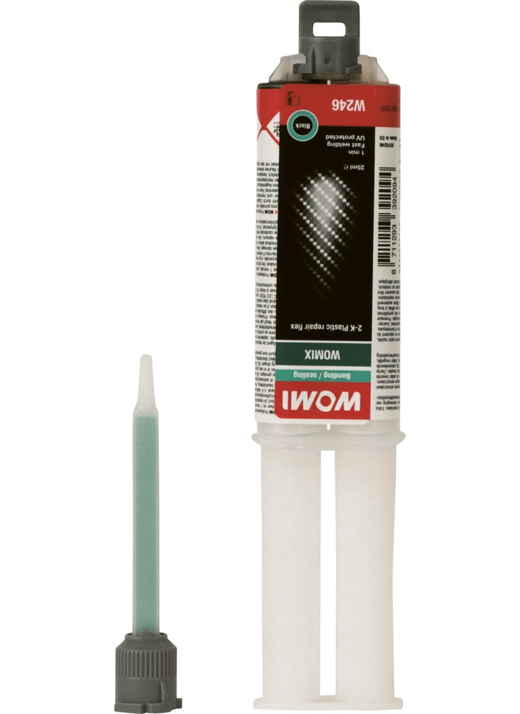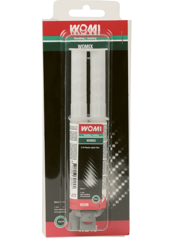 Womi 2K repair is de allerbeste 2 componenten lijm voor snelle flexibele reparatie of ijzersterke verbindingen. Womi W246 2K Plastic Repair Flex professioneel 2-componenten, self-mixing PU reparatie middel voor supersnel verlijmen en repareren van flexibele kunststof onderdelen. Extra snelle uitharding, te verwerken na 1 minuut, snel schuurbaar. Benadert de sterkte en flexibiliteit van synthetische materialen. De zwarte kleur ontstaat door toevoeging van koolstof, waardoor het product UV-bestendig wordt. Inclusief mixertip dus gegarandeerd altijd een perfecte menging en mengverhouding. De nieuwe speciale mixertipaansluiting voorkomt verkeerd opzetten. Inhoud 25ml. Womi, Max Performance One-Stop-Solutions.