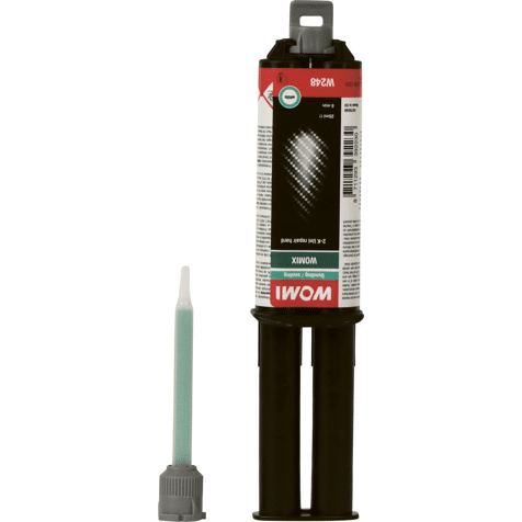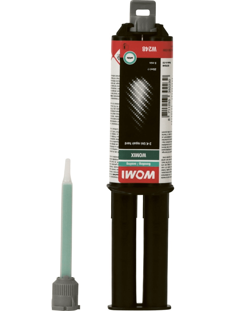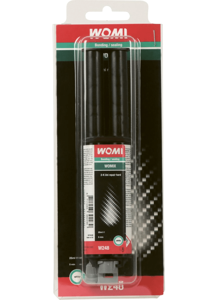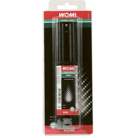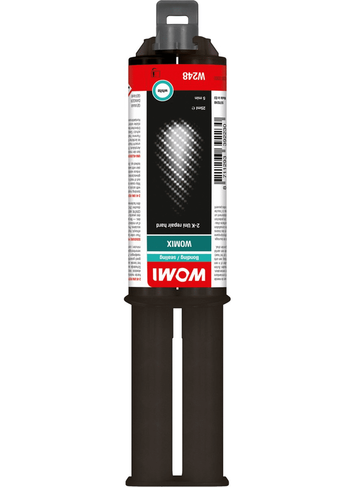 Womi 2K repair is de allerbeste 2 componenten lijm voor snelle flexibele reparatie of ijzersterke verbindingen. Womi W248 2K Uni Repair Hard professionele 2-componenten, self-mixing MA universele krachtlijm. Hoge treksterkte, slagvast en vullend vermogen. Voor het verlijmen van de meeste harde materialen. Inclusief mixertip dus gegarandeerd altijd een perfecte menging en mengverhouding. De nieuwe speciale mixertipaansluiting voorkomt verkeerd opzetten. Inhoud 25ml. Womi, Max Performance One-Stop- Solutions.