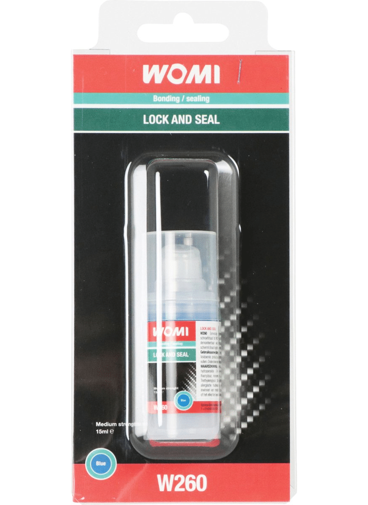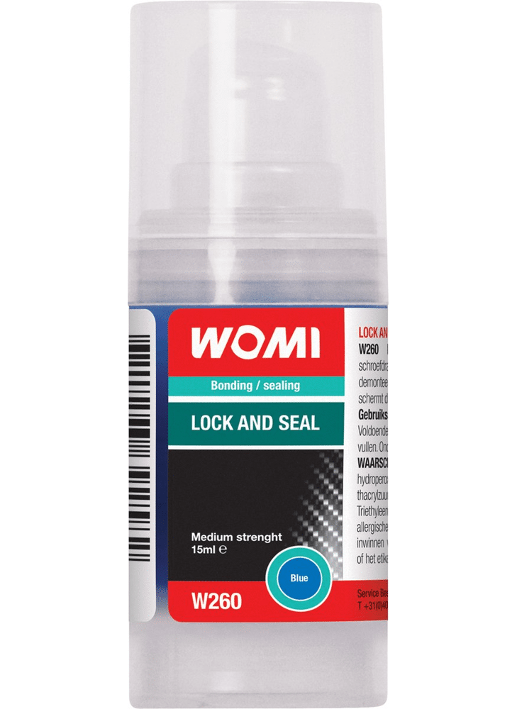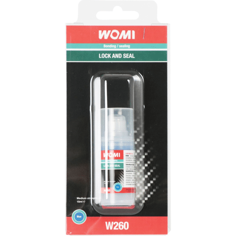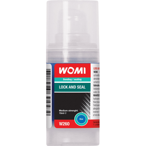 Womi W260 Lock and Seal Blue voor het borgen en afdichten van schroefdraad verbindingen. Borgt schroefdraad tot M36 en dicht af. De kleur blauw geeft aan dat het een medium sterkte is en eenvoudig demonteerbaar is met handgereedschap. Niet geschikt voor onderdelen in hout en kunststof. Inhoud 15ml. Eigenschappen: * Handvast: na 10-20 minuten * Functiegereed: na 1-3 uur * Eindsterkte: na 12 uur    * Temperatuursbestendigheid: -55°C tot +150°C